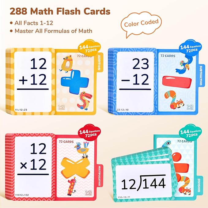 - Efficient Learning: 288 math flash cards cover all math facts from 1 to 12. Each card has two back-to-back equations instead of one! The answers are conveniently located on the bottom corner of the opposite side,easy to pratice and review
