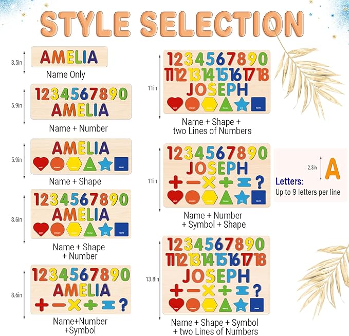 - 【Personalized Name Puzzle】A customized educational toy for kids, choose from 8 different matching options, provide back engraving, gift packaging options, and you can add a stand to display the puzzle.