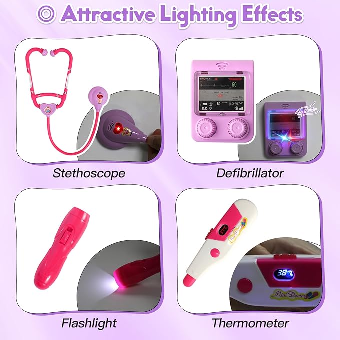 - Learning through Play: Our kids doctor play set includes a total 21 accessories such as stethoscope, thermometer, defibrillator and more, encouraging your child to pay attention to personal hygiene and understand basic medical knowledge
