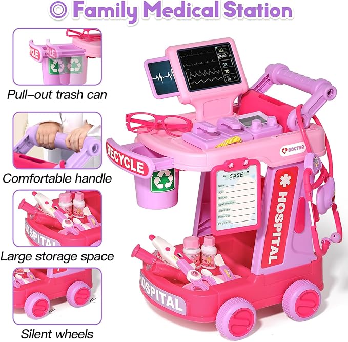 - Safe and Durable: Our effort to quality is reflected in every detail. The doctor kit is made of non-toxic, no-odor plastic, thoughtfully designed without sharp edges, upgraded anti-slip wheels are more stable for kids to push