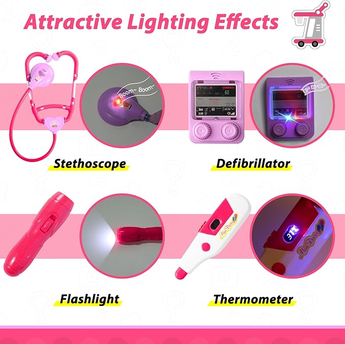 - LIKE A REAL DOCTOR: Liberry kids' doctor cart imitates the appearance of a real cart. Doctor costumes and medical tools with sound and light effects, allow your child to experience the fun of being a doctor