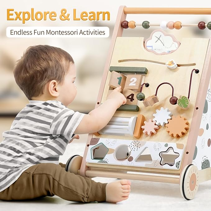 - Multi-Functional Push Walker - This wooden walker combines a push-pull walker and learning activity in one. The interactive panel that includes 8 activities such as mirrors, shape sorting, spinning gears, bead maze and more. These engaging learning activities keep your baby entertained, help them develop early skills and stimulate all senses. This is more than just a walker, it's your baby's early learning center!