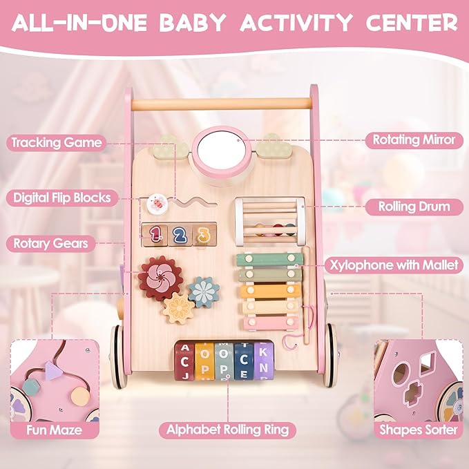 - đ§ăBaby Push WalkerăOur wooden baby walker is not just a reliable walker, it's also a multifunctional interactive push and pull learning activity toy. The exquisite Montessori toy design infuses it with vibrancy and joy, featuring a rotating mirror,Xylophone,Maze, Rotary Gears, Letter Rolling Ring, and Shapes Sorters for interactive play. With our activity walker, babies can enjoy hours of playtime while promoting cognitive development and hand-eye coordination in a colorful and fun environment.