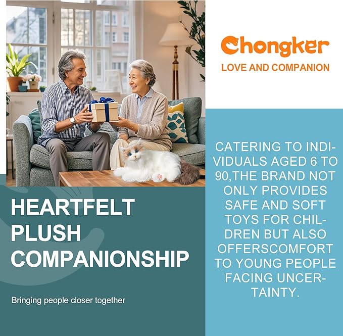 - Emotional Support Companionship: Chongker companion robot cats provide comfort, companionship, and joy to the elderly. They offer the pet companionship without the need for care or feeding, helping to soothe stress and emotional challenges.