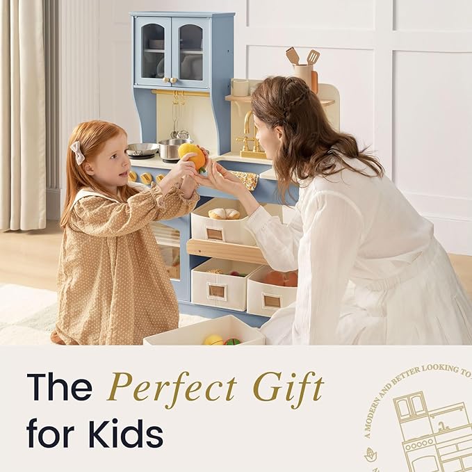 • Safe, Durable, and Stylish Wooden Build: Made with premium wood and child-safe finishes, this toddler play kitchen meets ASTM F963 and EN-71 safety standards. Modern home-style design blends beautifully with any room while offering long-lasting play value.