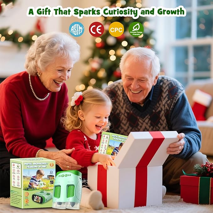 - 3-in-1 Discovery Tool: Combining microscope, telescope, and HD camera in one rechargeable device, kids can zoom in to observe tiny details or view distant scenes, then capture photos and videos with clarity. No need for multiple gadgets or disposable batteries—just one smart, portable explorer kit that keeps curiosity alive anytime, anywhere.