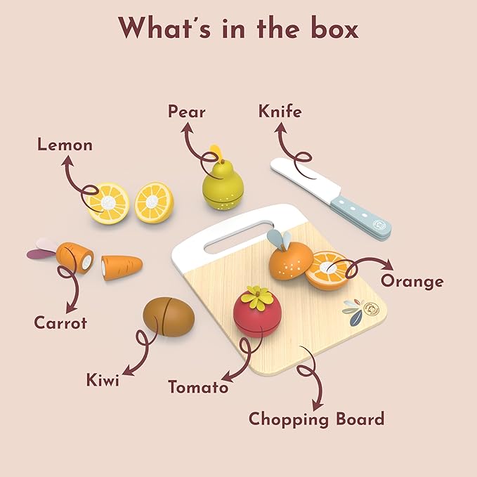 - π½πππππ ππππ πππππ ππππππ: Strengthens coordination and dexterity as kids use the included wooden knife and cutting board to chop food pieces apart. Ideal for building fine motor skills, confidence, and tactile development in early childhood.