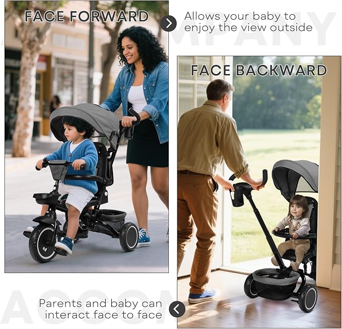 - 8 In 1 Tricycle: Accompany children at different stages; Multiple modes: push trike, toddler tricycle, steering tricycle, training trike or standard trike and so on; Reversible seat allow toddlers to enjoy the view or interact with their parents