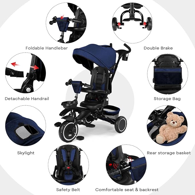 Kinder King Kids Tricycle, 8 in 1 Folding Toddler Trike w/Adjustable Push Handle, Rotatable Seat, Adjustable Canopy, Bell, Five-Point Harness, Storage, Toddler Stroller Bike for Age 6 Months+, Blue