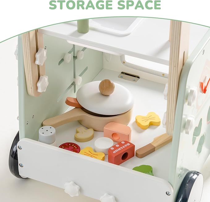 - Modern and Engaging Aesthetic: With its fresh green color schemes and charming patterns, this baby walking toy is visually appealing and adds springtime vibes to your home. The toddler walker push toy with light food cooking kitchen with oven design sparks child's curiosity and keeps toddlers entertained, making it a perfect addition to any playroom or living space.