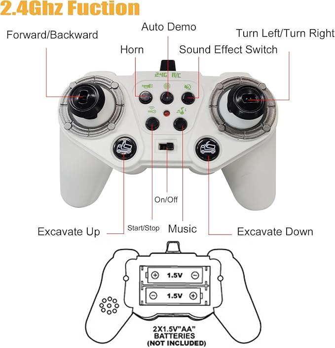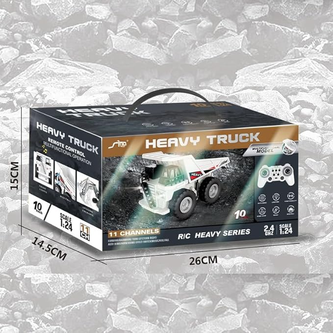 - Premium 1:24 Scale 10+ Realistic Functions:Experience immersive play with forward/backward movement, left/right steering, liftable cargo bed (raise/lower), horn sounds, engine sound effects, music playback, and one-touch demo mode – all designed to mimic real construction vehicles and spark imaginative role-play!