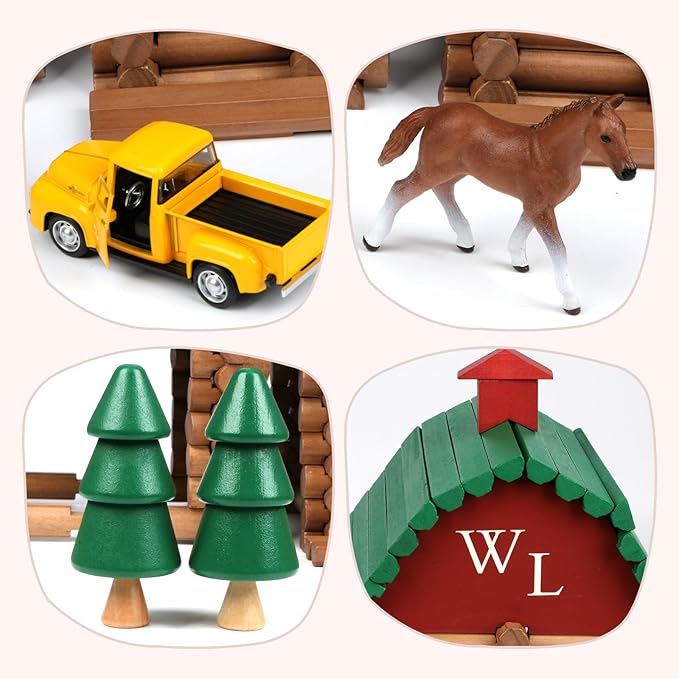 - 330PCS Wooden Log Cabin: The wooden log cabin set contains 330 pieces made of real, high-quality wood. Each has indentations that can be used to connect it with others. Including pickup truck, plus trees, horse, that add color and character to the building