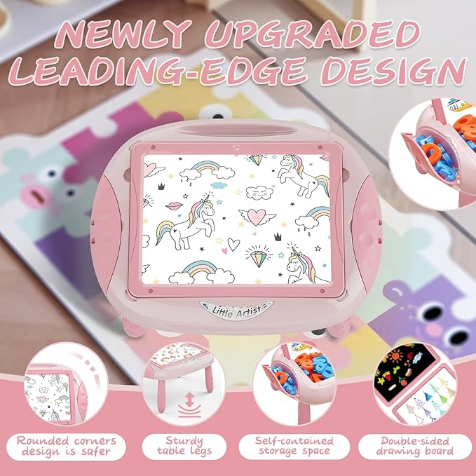- 🎨【Versatile Accessories To Inspire Kid's Creativity 】- The kid's coloring drawing table comes with 1 chalk holder, 1 blackboard eraser, 5 colored pens, 12 chalks, 25 number templates and 26 English alphabet templates. Kids can learn and draw through different combinations of these accessories, and the inside and sides of the doodle table provide space for accessories, which is more fun than drawing on paper.
