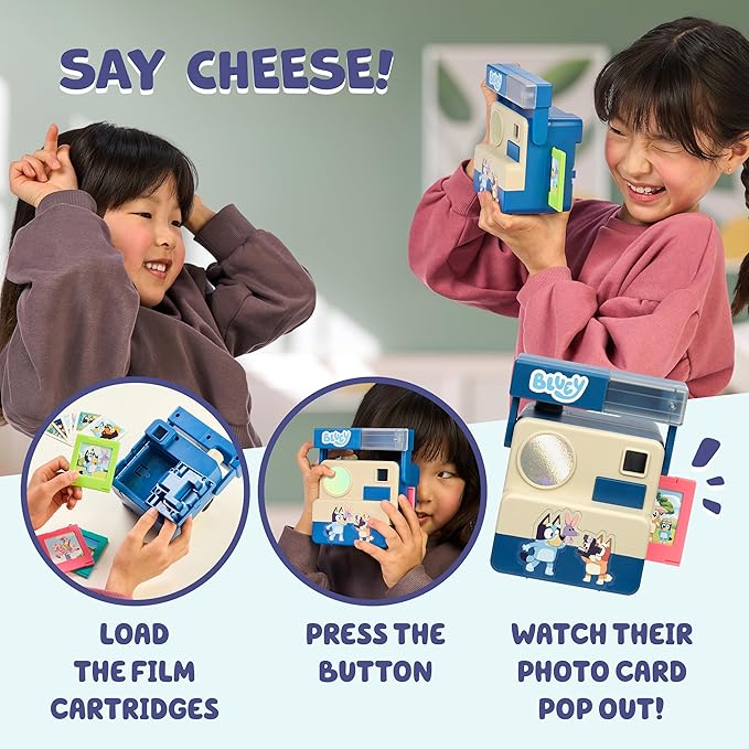 - Fun Photo Action: Each click reveals a surprise picture! Load the kids play camera with one of 3 included cartridges and watch one of 10 Bluey-themed photo cards pop out, igniting storytelling in your little one’s Bluey birthday gift