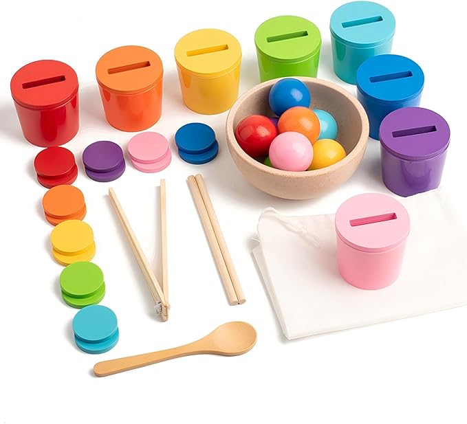 Ball in Cups Toddler Montesssori Toys for 1 Years Old, Rainbow Color Sorting Toy Coin Box Matching Game, Wooden Learning Color for Baby Toddler Age 1-3, Fine Motor Developmental Infants Sensory Toy