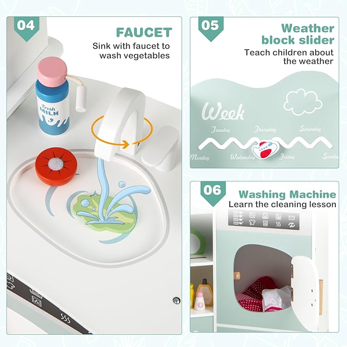- Vivid Sound & Light: In order to give little one with an immersive cooking experience, INFANS wooden toy kitchen have realistic sound and light effects. When kids turn the knob, it makes sounds and lights. Also, this kitchen equipped with n range of interactive features including a coffee maker, washing machine, microwave, stove, clock, weather slider, oven and cabinets. Note: 4 x AAA battery (not included).