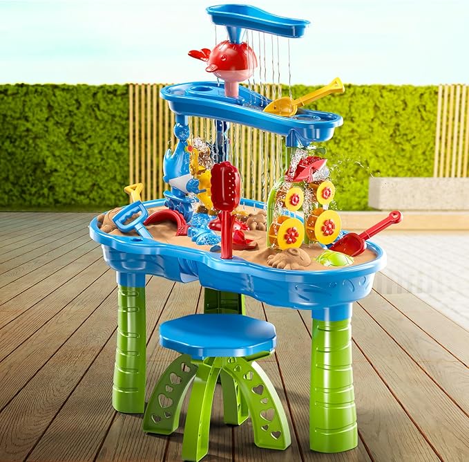 3-Tier Kids Water Table for Toddlers Kids Ages 3-5 4-8, Summer Outdoor Water Table Beach Kids Toys, Toddler Sensory Activity Sand Box Play Set with Rain Showers Splash Pond for Boys Girls