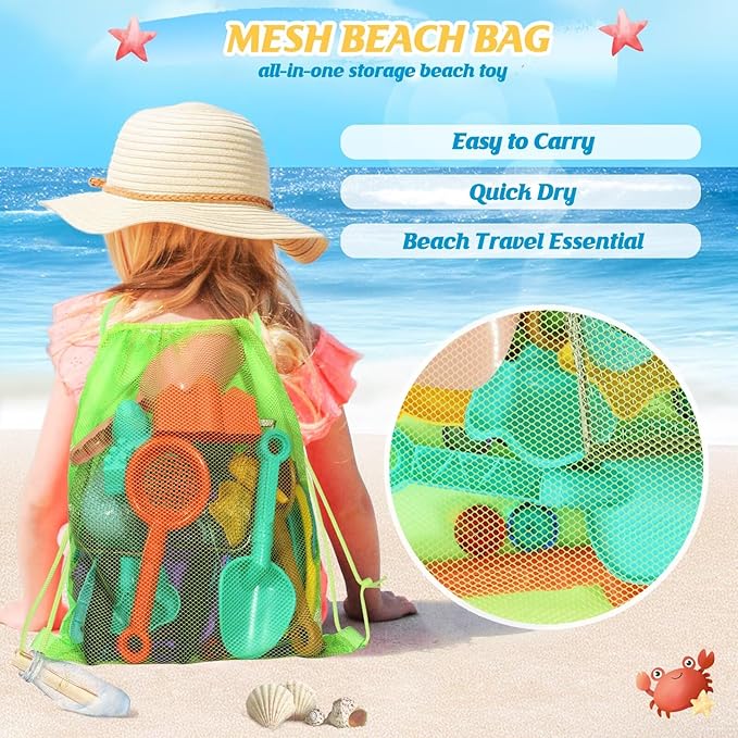 - 【Easy Carry & Storage Mesh Beach Bag】 Large capacity can easily accommodate all the sand toys. All sand molds and beach shovels can fit easily into the bag. The bags breathable mesh design allows them to dry quickly to help expel sand and water, and kids can easily carry all to the beach or outdoors.Take Huitem sand sifter for the beach and go to the seaside to find treasure, collect all kinds of shells, conches, starfish, pearls and more!