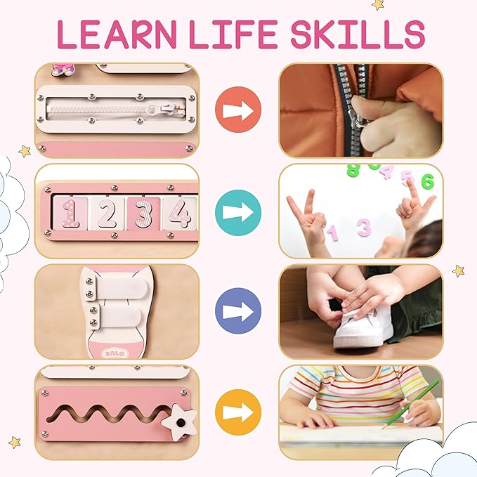 - 【Educational Playtime】Beyond its aesthetic appeal, this large busy board serves as an engaging educational toy. It facilitates learning, helping toddlers memorize and spell their names, recognize colors and letters, and enhance fine motor skills. It's a colorful and interactive way to promote early learning.