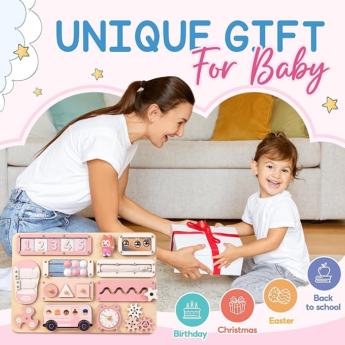 - 【Versatile and Thoughtful Gifts】These montessori busy board make perfect and unique gifts for various occasions, including baby showers, birthdays, Easter, baby valentines, Christmas Gifts, and New Years. With thoughtful engraving and free carton packaging, it's a heartfelt present that leaves a lasting impression.