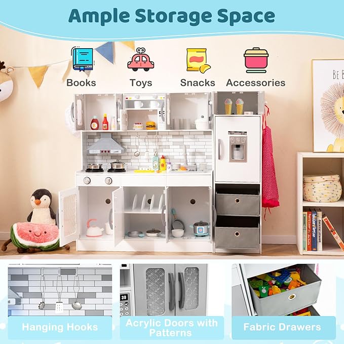 - Rich Features & Storage Space: Featuring an ice maker, coffee machine, microwave, oven, and dishwasher, this wooden toy kitchen set offers a variety of gameplay options for your child. In addition to that, it boasts ample storage space to store kids’ books, toys, snacks, accessories, and other items.