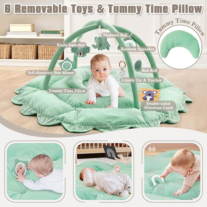 - 6 ENGAGING BABY TOYS & TUMMY TIME PILLOW: Support your baby’s growth with our roomy tummy time mat, made from high-quality cotton for comfort and long-lasting use. It includes 6 removable sensory toys, such as a koala, elephant, and rainbow, to stimulate your baby’s senses. The set also features Double-Side Cards for learning and a Tummy Time Pillow for added comfort. Ideal for babies at every stage, this all-in-one play space encourages developmental progress in a fun, secure setting