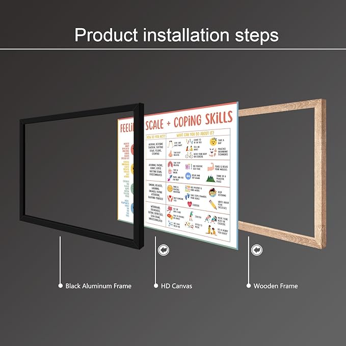 - 【Feelings Chart For Kids Posters Size】 12x16inch(30cm x 40cm), This kids learning posters decorative painting has a black metal frame,There's a wooden frame embedded in it. Just a simple operation can display him in your favorite living space. Impress children, your family, and even your guests.