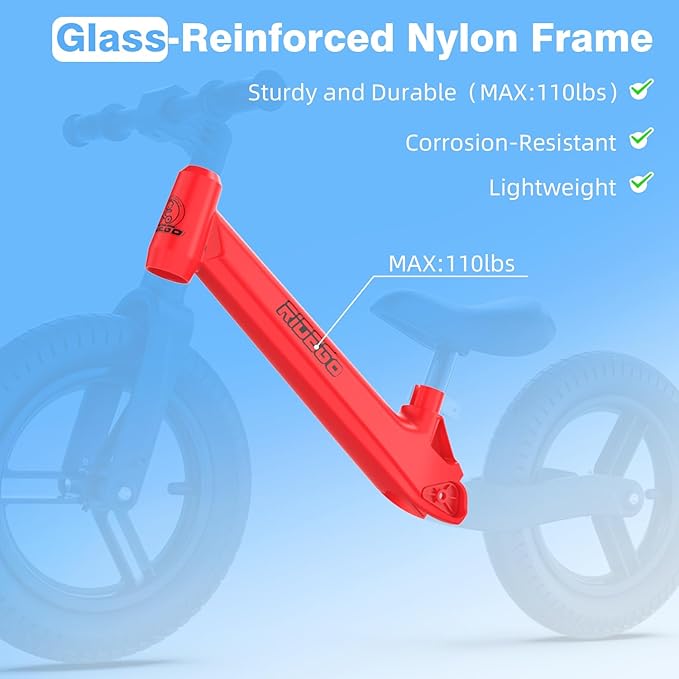 - 【LIGHTWEIGHT & DURABLE FRAME】 Built with a glass-reinforced nylon frame, this kids balance bike 3+ year old matches the strength of carbon steel, supporting up to 110 lbs while weighing only 7.06 lbs. The corrosion-resistant frame prevents rust, ensuring durability. Lightweight and easy to handle, it's perfect for kids to ride and parents to carry.