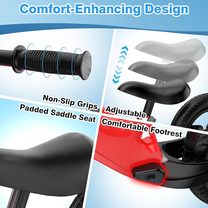- 【THOUGHTFUL DESIGN FOR COMFORT】Featuring an adjustable seat height (12.2"–16.9") to grow with your child, a soft padded saddle, a rest footrest, and non-slip handlebars for enhanced control and comfort. Silicone shock-absorbing strips at the frame joints further improve riding stability.