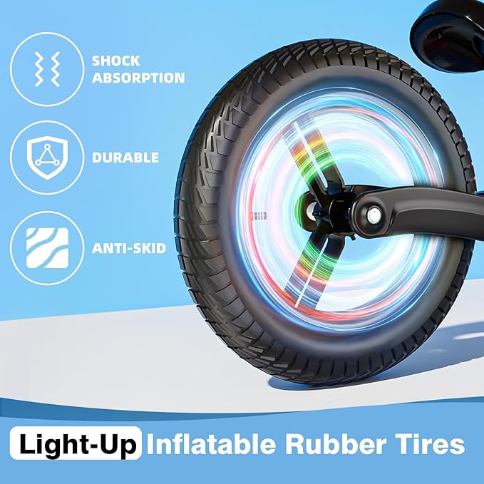 - 【GLOWING AIR RUBBER TIRES】Featuring air-filled rubber tires for superior shock absorption and a smooth ride on grass, gravel, and pavement. The built-in motion-activated lights require no batteries—just spin the wheels to illuminate their adventure, adding extra fun and visibility.
