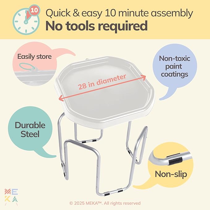 - SMALLER SIZE & ADJUSTABLE STAND – Slightly smaller than MEKA Large Tuff Tray, measuring 28" in diameter and fits up to 4 children. The stand can be set at 3 different heights: 18 inches, 22 inches, 26 inches; ideal for different ages and activities!