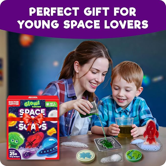 - ✅ CREATE YOUR OWN SPACE SOAPS: Doctor Jupiter Space Super Soaps is the ultimate soap making kit for kids ages 4-6-8-12, offering hours of creative fun! Kids can craft glowing soaps in fun shapes like aliens, rockets, and shooting stars - mixing colors and scents for an out-of-this-world creation!