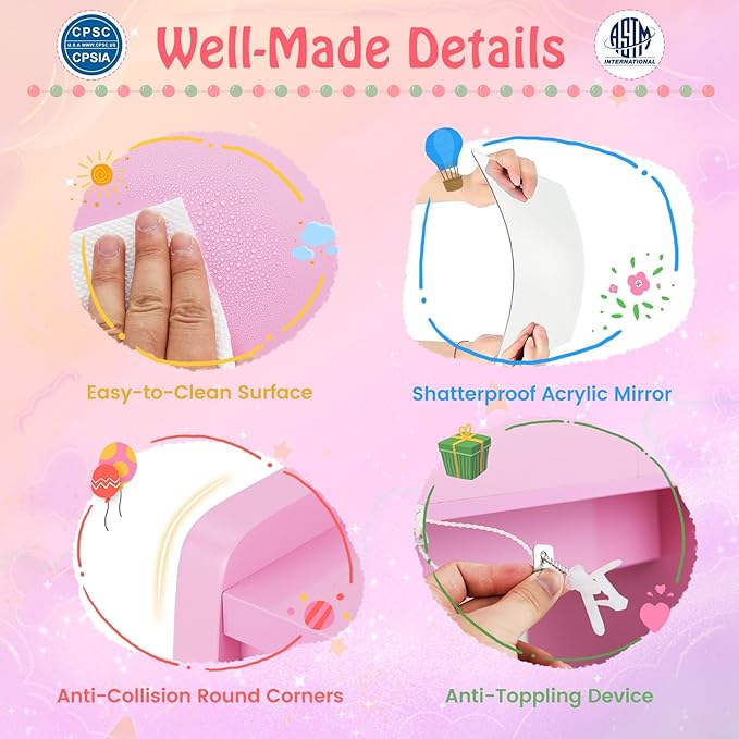 - Child-Safe Features: This ASTM and CPSIA compliant princess vanity set features a shatterproof acrylic mirror to withstand playful interactions. Rounded corners minimize the risk of bumps and bruises, ensuring a safer play environment for your little ones.
