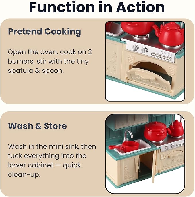 - COOKING & MEALTIME PLAY: A little kitchen setup invites tiny prep, cook and serve moments as children host small meals, chat at the table and share gentle stories