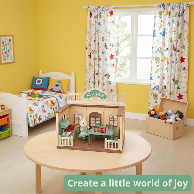 - WHAT’S INCLUDED (FIGURE INCLUDED): Kitchen dollhouse playset with bunny figure, kitchen unit, table, four chairs and small cookware pieces