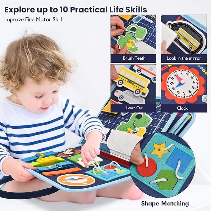 - āØMaster Practical Life Skills: From zippers and snaps to buckles and ties, our busy book transforms everyday tasks into exciting challenges. Kids will love sorting colors, assembling puzzles, and matching shapes, all while developing dexterity and muscle control. Unique additions like gear-turning, time-telling dials, and a pretend car dashboard (complete with a mirror "rearview" and press-to-beep horn) make learning immersive, blending play with real-world skills. The first-page storage pocket keeps all small pieces neatly contained, teaching organization while ensuring no lost parts.