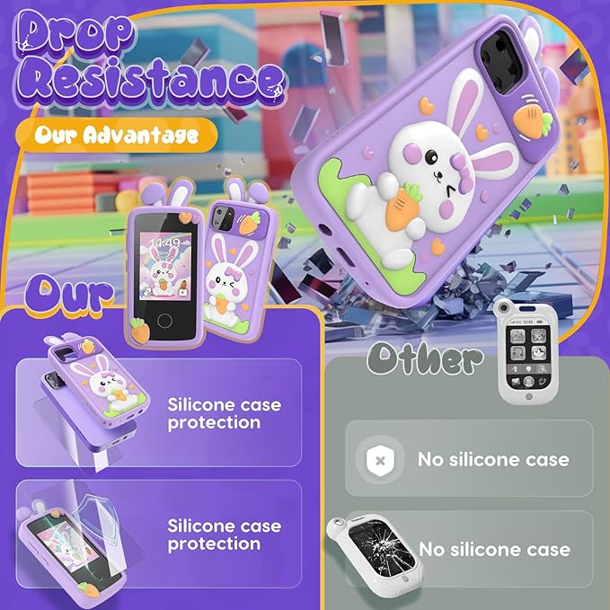 - 🦄[Drop Protection]- A unicorn toy for 4-6 year old girls with a durable silicone shell, this toy phone can withstand accidental drops. The cushioned, shock-resistant shell ensures protection and comes with a tempered film to protect the screen and extend its life. Its versatility allows your child to engage in a variety of activities, making it a durable toy.