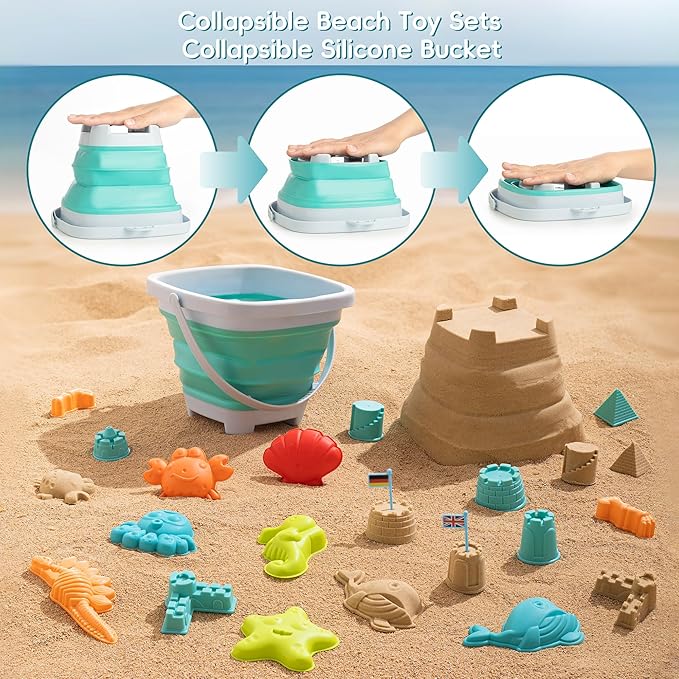 - 🌞【Easy to Carry】- Our travel beach toys are highly portable. The collapsible sand bucket can store all the accessories, and we provide a mesh bag for convenient transportation. Now your children's sand playset can accompany them on trips to the beach or any outdoor adventure, great baby beach essentials.