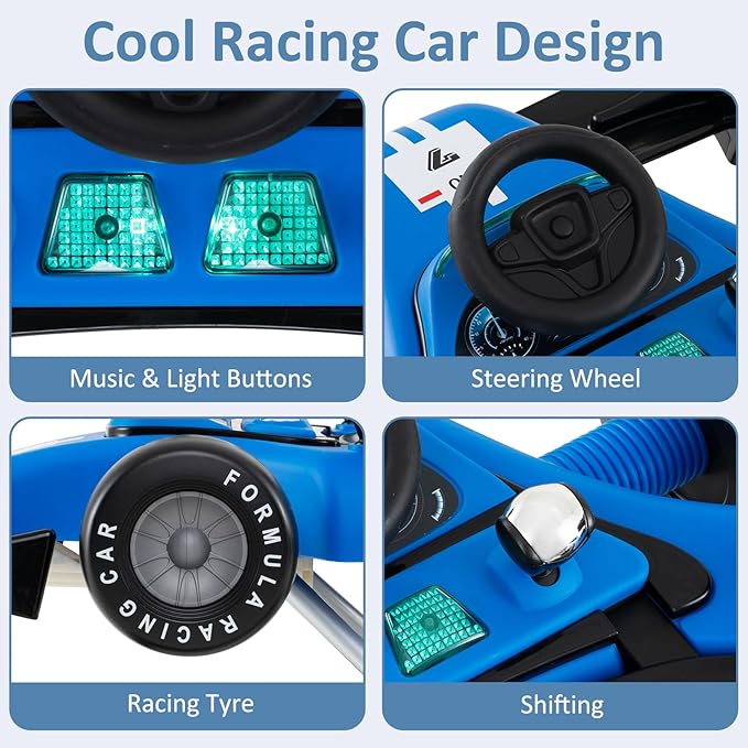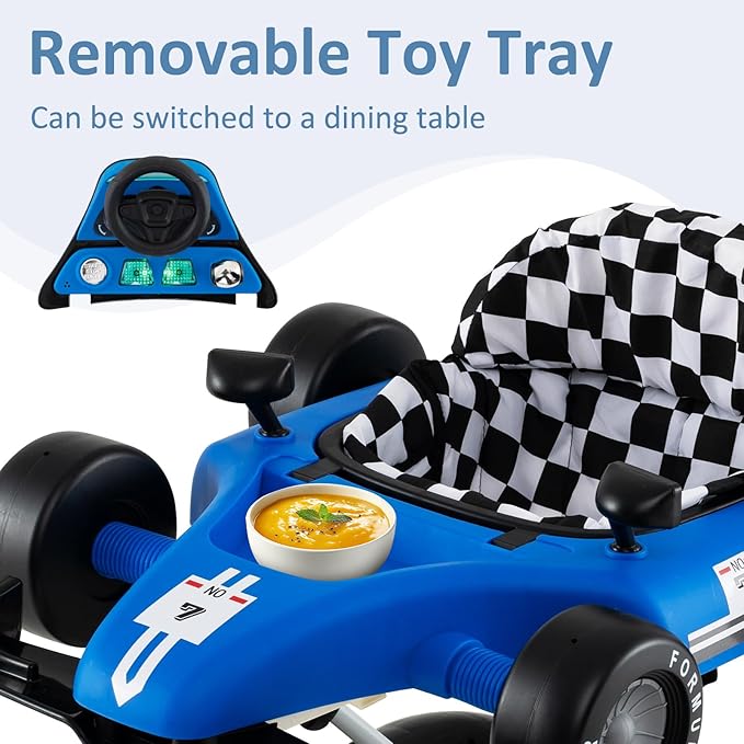 - Fun Activity Center: The toddler activity center has a cool racing car appearance, and equipped with simulated steering wheel, shifter, rearview mirror, light buttons, music to satisfy child's curiosity for exploration and early learning. The center panel requires 2 AA batteries (not included)