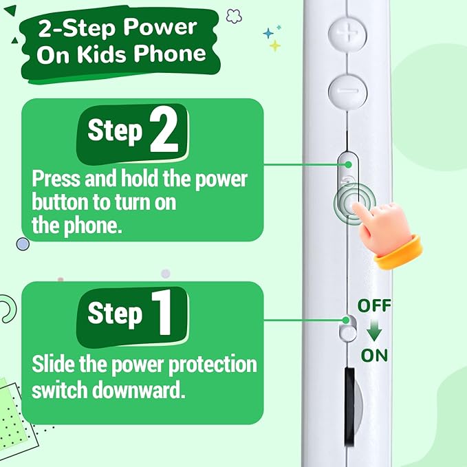 - Warm Tips:For the first use, please slide the power protection switch downward, then press and hold the power button to turn on the phone.This is a learning cell phone toy for kids ages 3-8.All programs pre - installed. No web, call, or text.