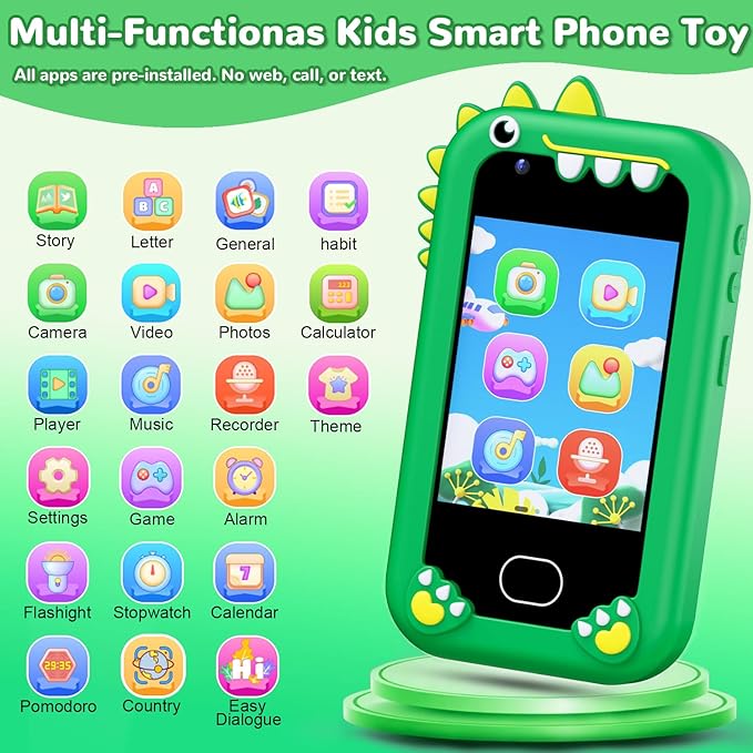 - 2025 Educational Smartphone Toy:The upgraded touchscreen kids cell phone comes with various features, including dual camera, MP3 player, games, recorder, country , alarm, story, A-Z letter and more. It offers convenience, fun, and a new experience for kids ages 3-8 and keep them free from parent's phone.