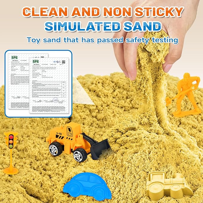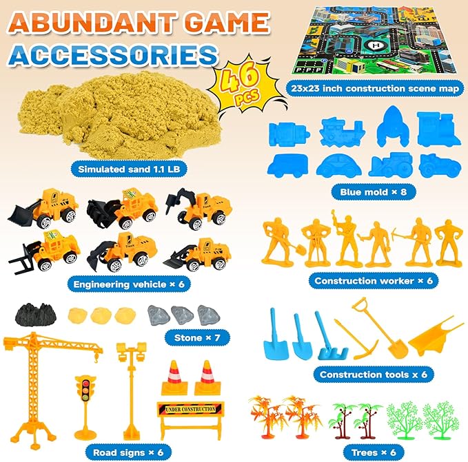 - Abundant Accessories: The Sand Play Set includes:1.1 pounds of simulated sand, 6 construction vehicles, 23.2 * 23.2 inch plastic pads for construction scenarios, 8 sand molds, 3 sand tools, 6 construction workers, 3 construction tools, 6 road facilities, 7 stones, and 6 trees.