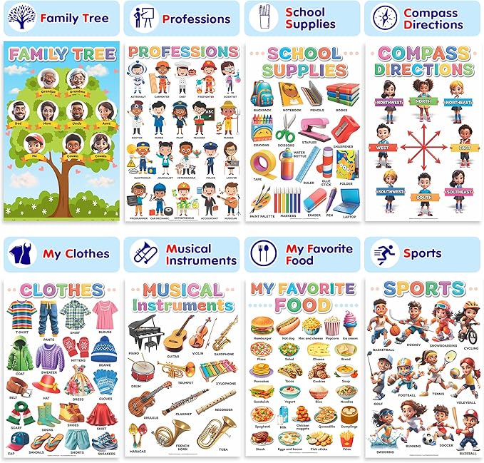 - These versatile posters are great for kindergarten charts for home, homeschool organization, homeschooling posters and ESL teaching materials for kids. Charts included: Family Tree, Professions, School Supplies, Compass Directions, My Clothes, Musical Instruments, My Favorite Food, Sports, Opposites, Fruits and Vegetables, Camping, My Chores, Domestic Animals, Good Manners, Parts of the Plant, Transportation
