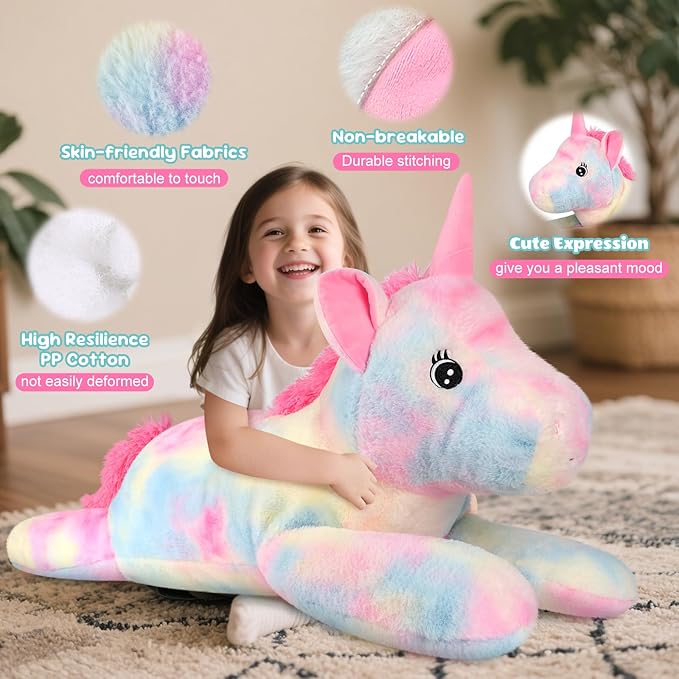 - Life-size Hugs, Endless Comfort: Towering at 43 inches, 3.6ft, this giant stuffed animal for girls and boys delivers full body snuggles like a real-life friend! This cute plushies unicorn toy engineered with precision stuffed PP cotton, jumbo rainbow pink unicorn plush offers the ideal balance of cloud-like softness and supportive cuddling that melt away stress