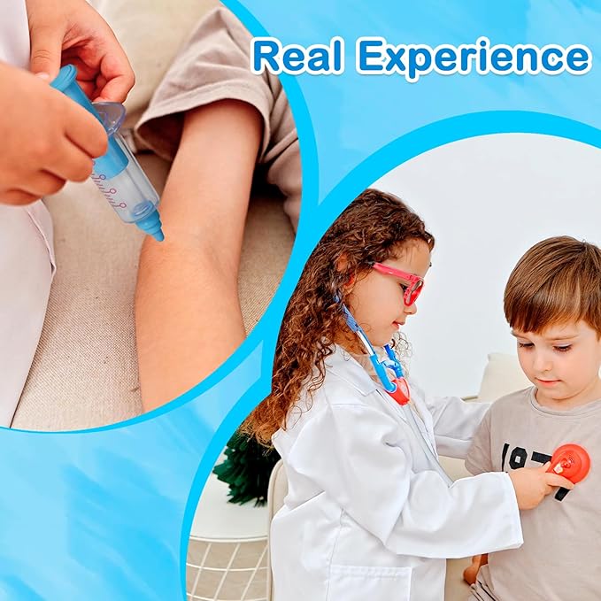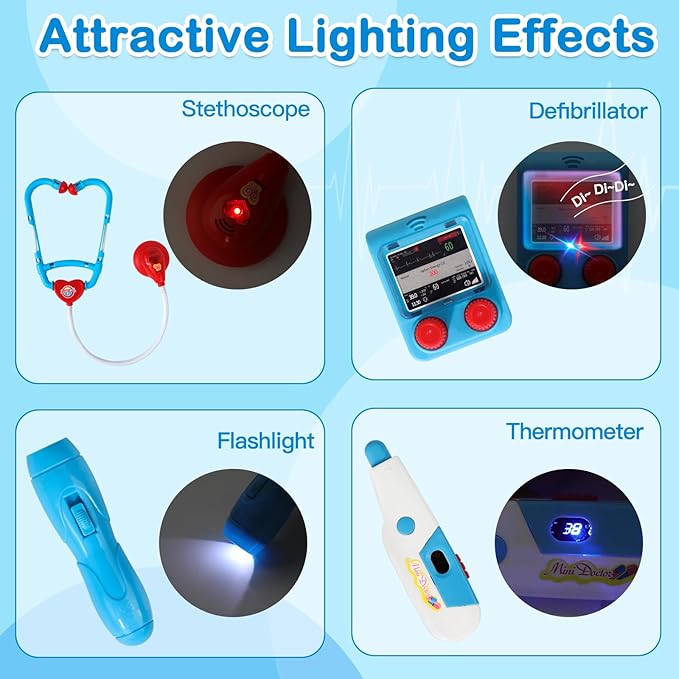 - Realistic Doctor Experience: Our medical toy kit is designed from a real cart, medical tools with sound and light attract the child's attention, providing hours of play. Through role-playing, children can stimulate their imagination and satisfy their curiosity while learning basic medical knowledge.