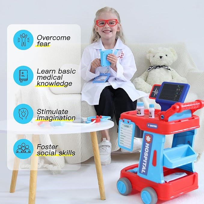 - Multifunctional Accessories: Our doctor cart set includes: stethoscope x1, Id card x1,syringe x1, scissors x1, scalpel x1, thermometer x1, tray x1, pill bottle x2, medicine spoon x1, eye glasses x1, flashlight x1, defibrillator x1, Electrode boards x1, ECG display x1, doctor coat x1, sticker x2, medical record x1, doctor cart x1