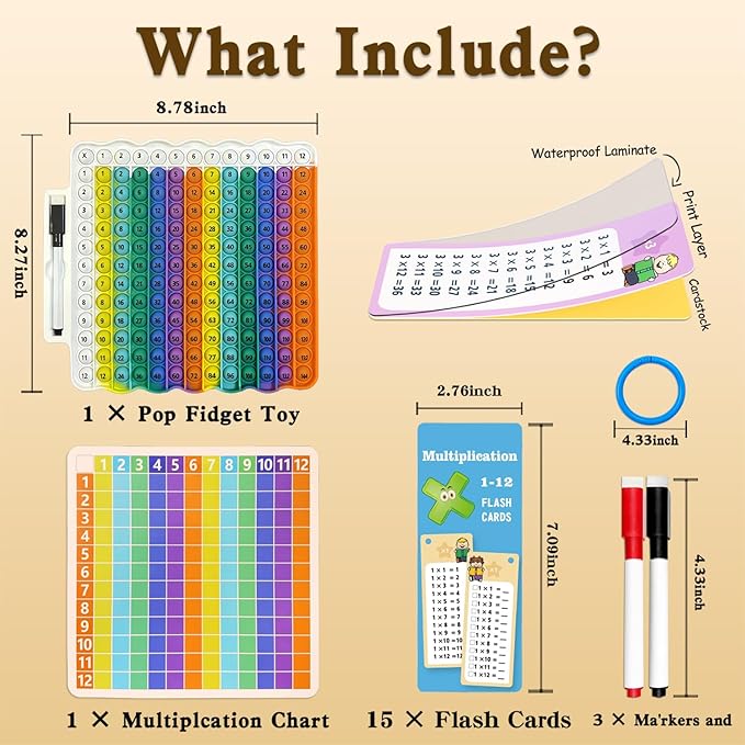 - You Can Get: The set contains 15 Multiplication flash cards (1-12) + 1 Pop Fidget Chart + 2 black and red markers + 1 binder ring + 1 Multiplication Practice Cardboard, efficient and practical combination learning and teaching tools