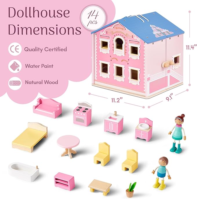 - ๐ Folds Up & Goes Anywhere โ Cute pink wooden dollhouse for girls folds into a portable case with a built-in handle, making it easy to store, carry, and take on the go for endless hours of fun, perfect for travel or tidy home play. Size:11.4' H X 9.1' W X 11.2' L.