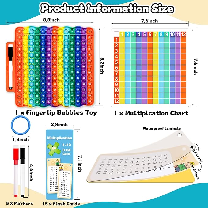 - The Best Gift for Kids: Multiplication flashcards measure 2.8x7inch, fingertip bubbles toy measure 8.8x8.3 inch, The multiplication chart is very suitable as a gift for boys and girls, children can learn happily through games