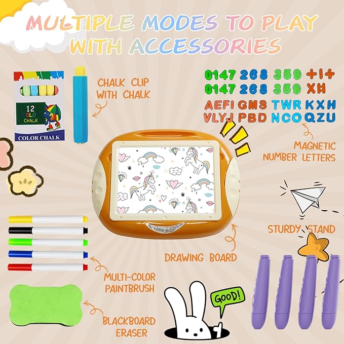 - đ¨ăRich Creative Accessoriesă- Comes with 1 chalk holder, 1 blackboard eraser, 5 colored pens, 12 chalks, 25 number templates and 26 English letter templates. kids can use these accessories to study and draw, and the interior and sides of the graffiti table also provide space to store accessories, making drawing more convenient.